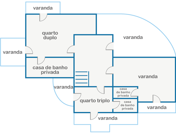No rés-do-chão a moradia tem dois quartos com camas de casal, e no primeiro andar tem um quarto com uma cama de casal e dois quartos com camas de solteiro, com a possibilidade de juntas formando camas de casal. Todos em suite.
